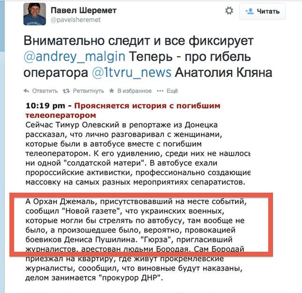 Теперь внимание. Вот, что пишет Мальгин: «А Орхан Джемаль, присутствовавший на месте событий, сообщил "Новой газете", что украинских военных, которые могли бы стрелять по автобусу, там вообще не было, а произошедшее было, вероятно, провокацией боевиков Дениса Пушилина. "Гюрза", пригласивший журналистов, арестован людьми Бородая».