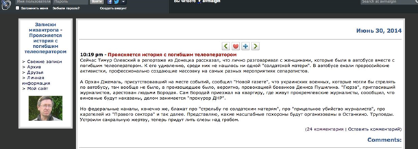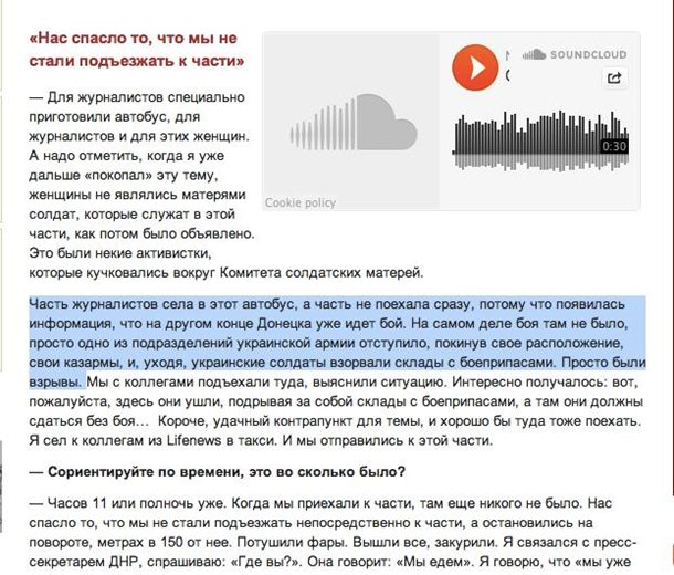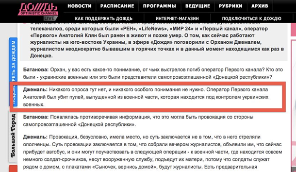Это, повторяю, перепостил Шеремет. Не проверив написанное. Проверил я. Для этого зашел на «Новую Газету» и прочел все интервью Джемаля. Я нашел слова Орхана, которые Мальгин или от нумения читать, или от возраста принял за то, что украинских военных «там не было». Где – ТАМ? «Часть журналистов села в этот автобус, а часть не поехала сразу, потому что появилась информация, что на другом конце Донецка уже идет бой. На самом деле боя там не было, просто одно из подразделений украинской армии отступило, покинув свое расположение, свои казармы, и, уходя, украинские солдаты взорвали склады с боеприпасами. Просто были взрывы. Мы с коллегами подъехали туда, выяснили ситуацию.