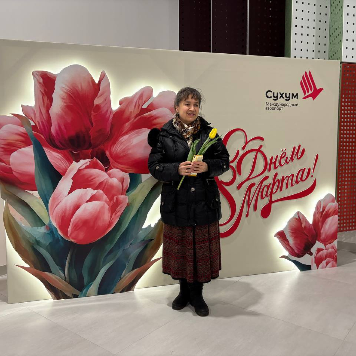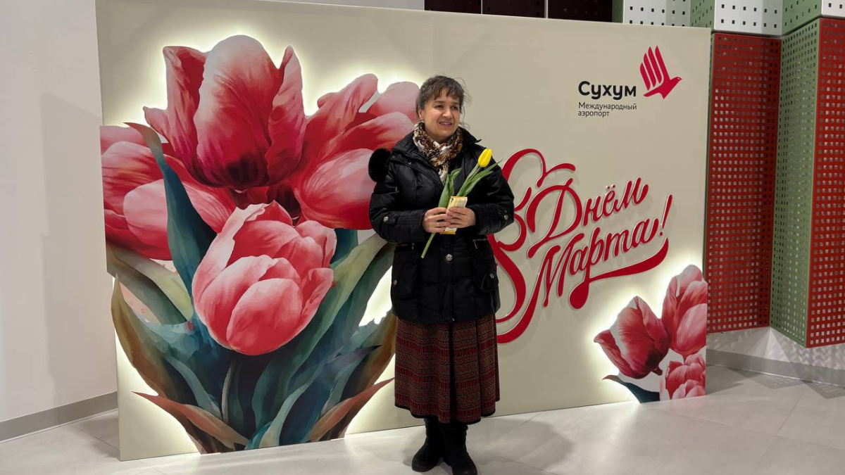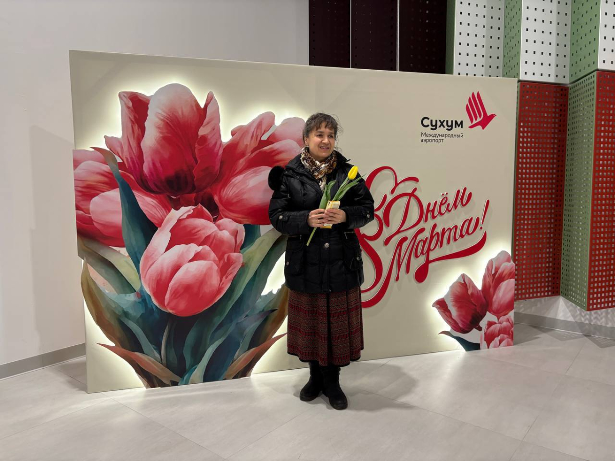 В международном аэропорту Сухум имени В. Г. Ардзинба в преддверии Международного женского дня прошла праздничная акция: в зале ожидания для посетителей организовали тематическую фотозону, а сотрудники авиаузла поздравляли женщин, вручая им тюльпаны и сладкие подарки.