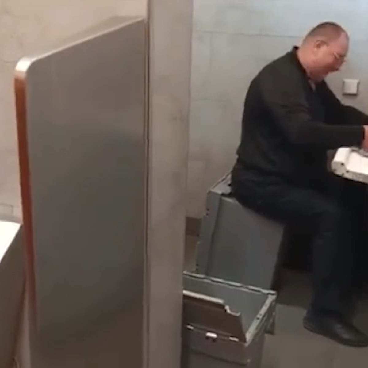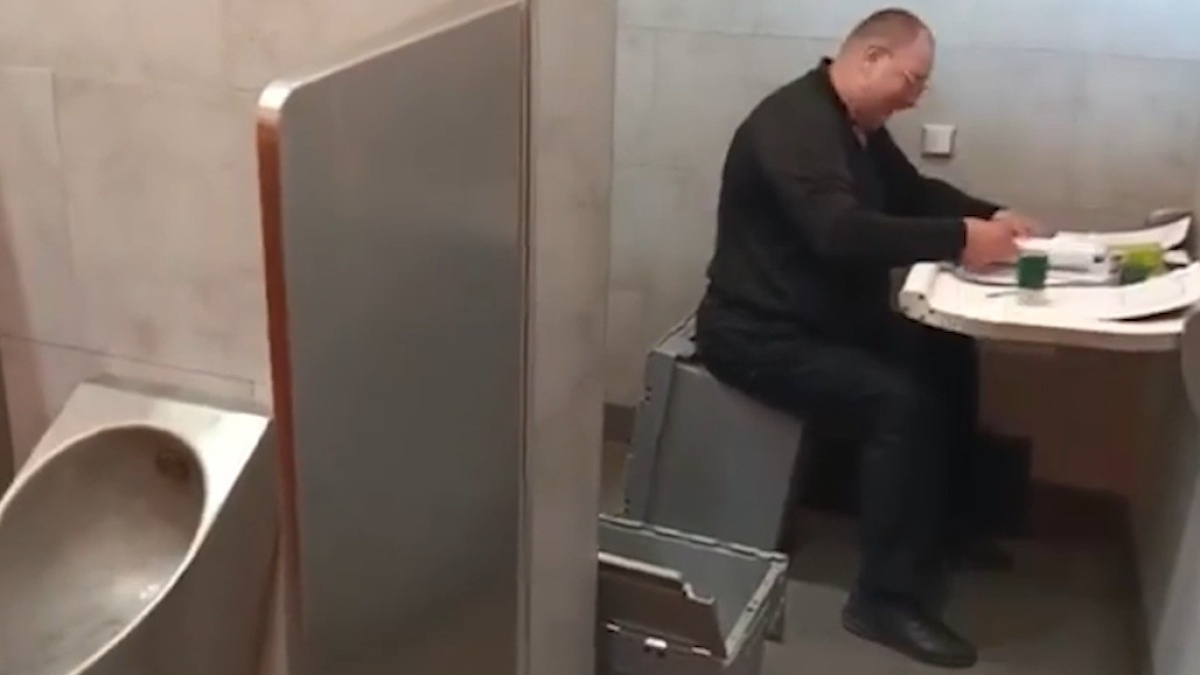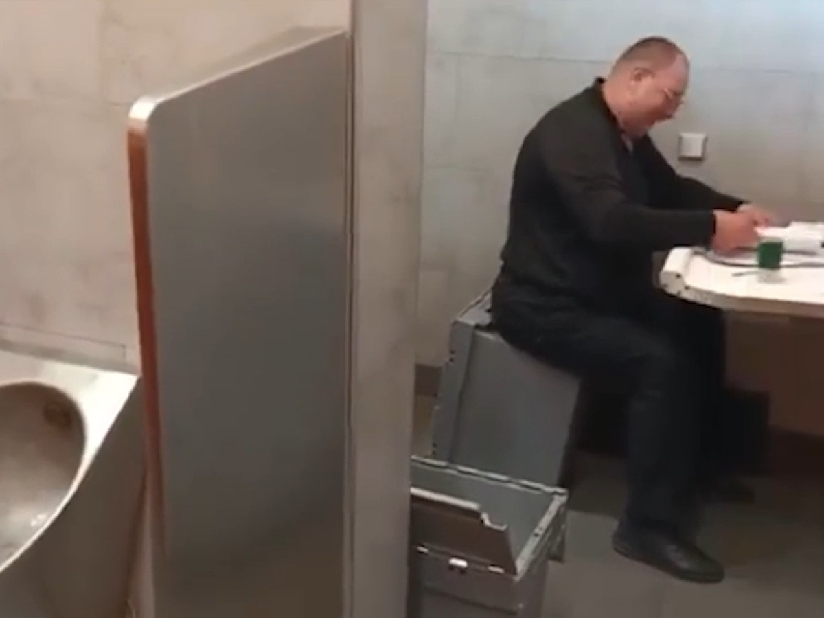 На записи мужчина расположился на опрокинутом ящике для денег, разложил документы на пеленальном столике и начал ставить на них печати. Рядом находятся как минимум двое помощников, один из которых фиксирует происходящее на камеру. Компания общается по-русски и обменивается шутками по поводу импровизированного "офиса" и попадающих в кадр писсуаров.