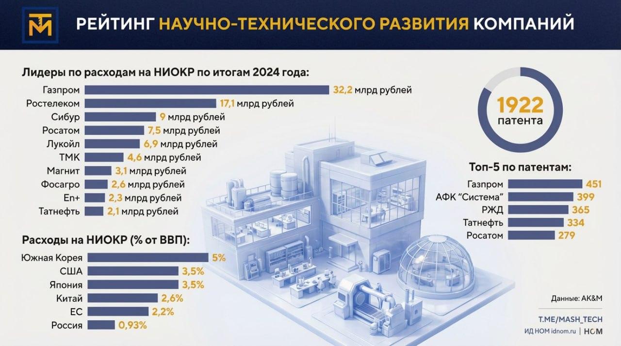 "Расходы на НИОКР в России в 2024 году были на уровне 0,93% ВВП. Таким образом, наша страна отстаёт по этому показателю от таких мировых лидеров как Южная Корея (5%), США (3,5%), Япония (3,5%), Китай (2,6%) и ЕС (2,2%). Впрочем, стоит ли ЕС в этом случае рассматривать как единое целое - вопрос дискуссионный", – заключил "МашТех".