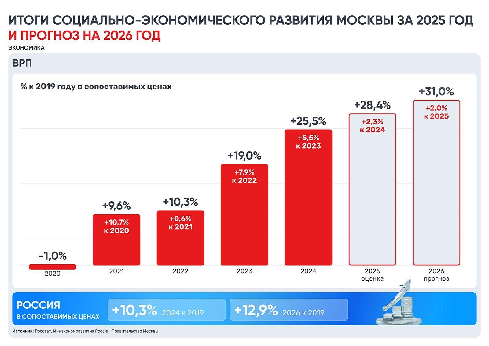 Во время встречи с президентом России Владимиром Путиным мэр Москвы Сергей Собянин заявил, что валовый региональный продукт (ВРП) города вырос на 28,4% с 2019 года. По итогам прошедшего года рост ВРП должен достичь 2%.