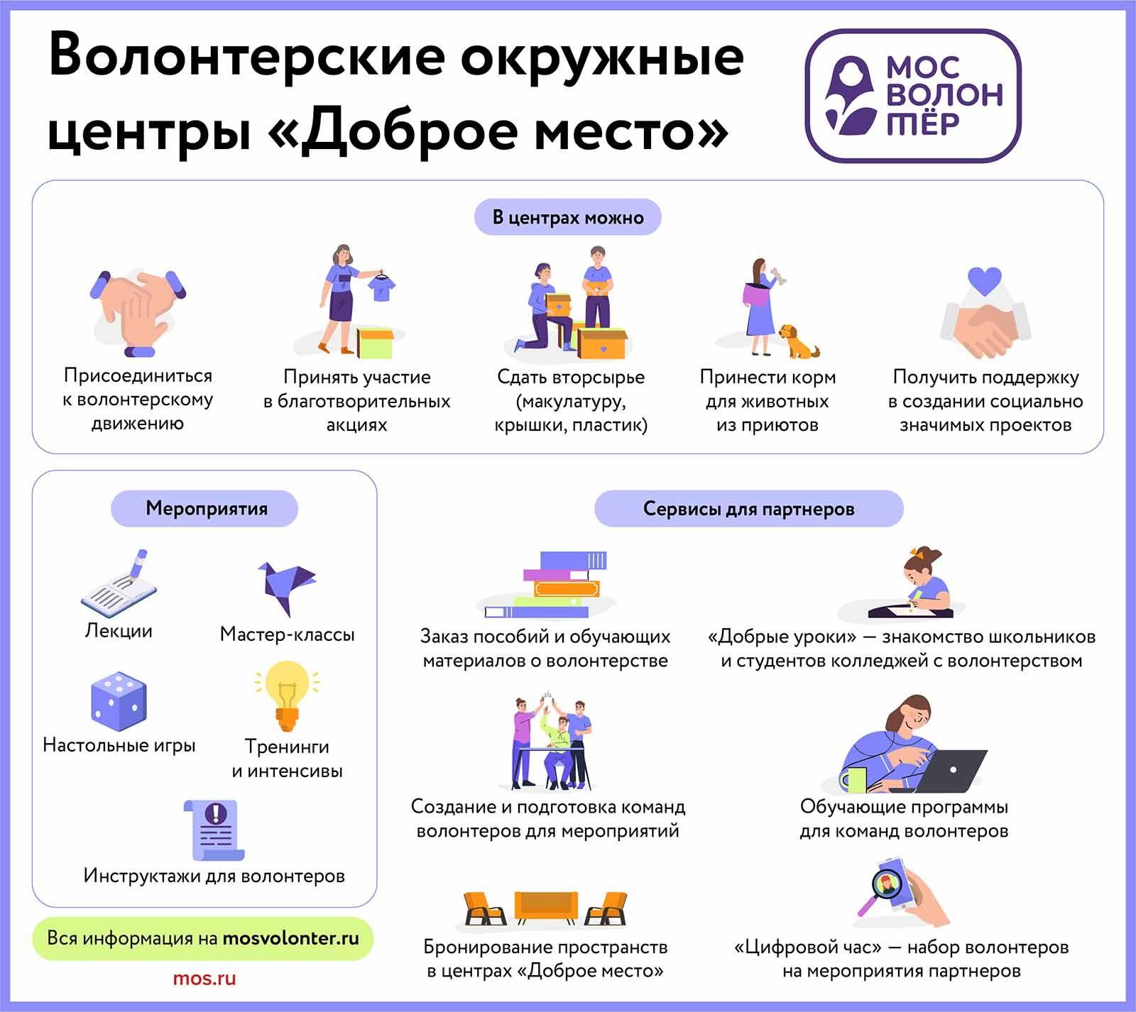 Заместитель мэра Москвы Наталья Сергунина сообщила, что за 4 года в Москве появились 10 окружных волонтёрских центров "Доброе место", которые посетили 85 тысяч москвичей разных возрастов. По словам вице-мэра, каждая такая точка представляет собой многофункциональное пространство.