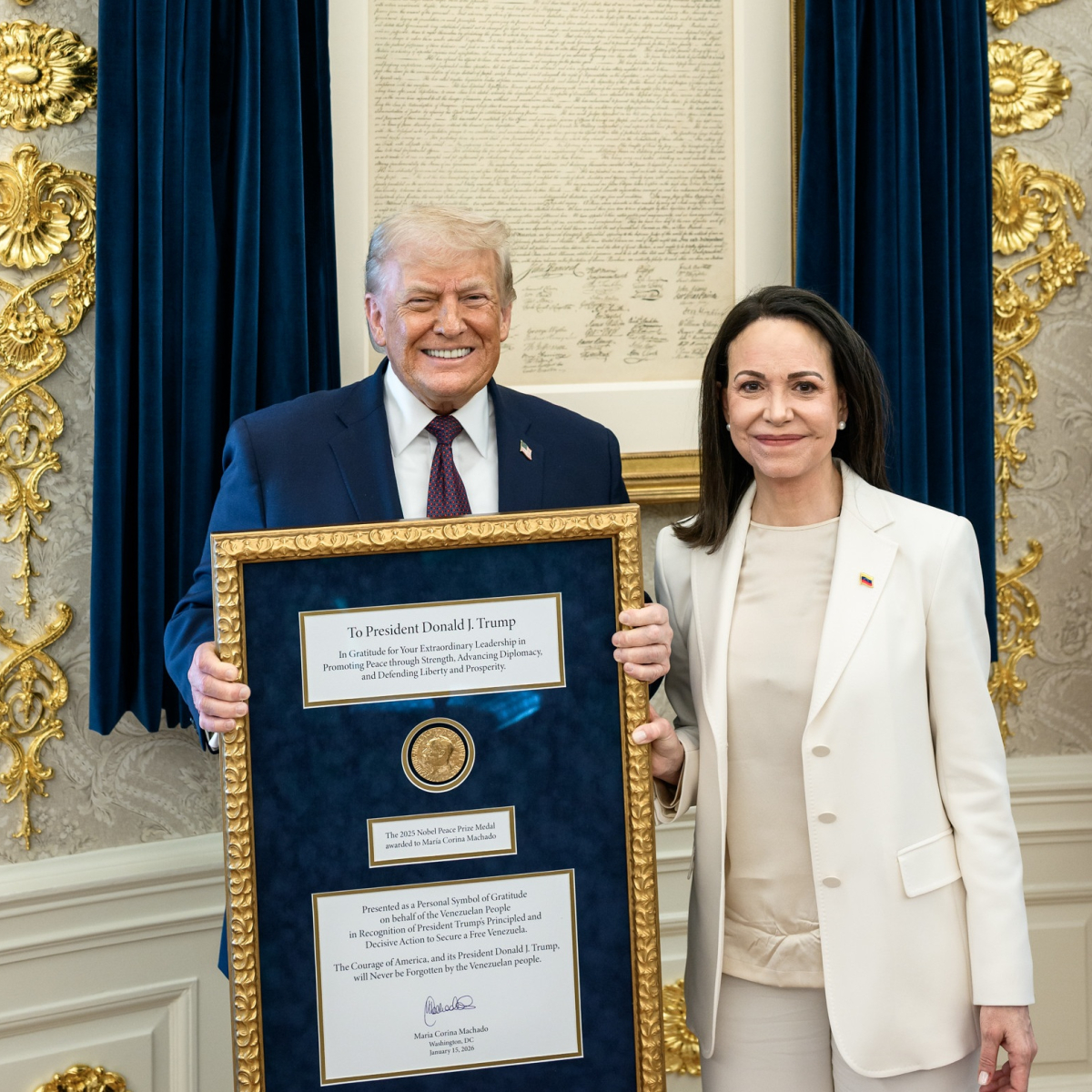"Я говорила президенту Трампу, что 200 лет назад генерал Лафайет передал Симону Боливару медаль с изображением президента Джорджа Вашингтона. С тех пор Симон Боливар никогда с ней не расставался. 200 лет спустя народ Боливара вручает президенту США, наследнику Вашингтона, медаль Нобелевской премии как признание его приверженности нашей свободе", — пояснила Мачадо журналистам.