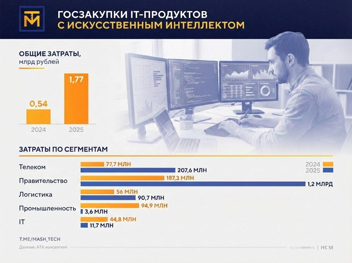 Закупки программного обеспечения с искусственным интеллектом в 2025 году выросли в 7,4 раза и составили 1,8 млрд рублей. В промышленности и IT закупки снизились в денежном выражении, отмечает телеграм-канал "МашТех", ссылаясь на исследование "АТК консалтинга".