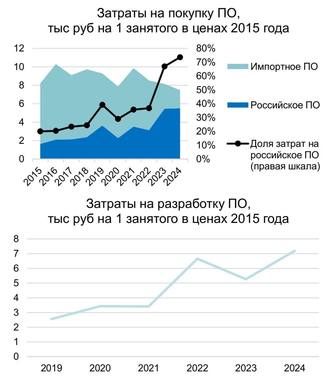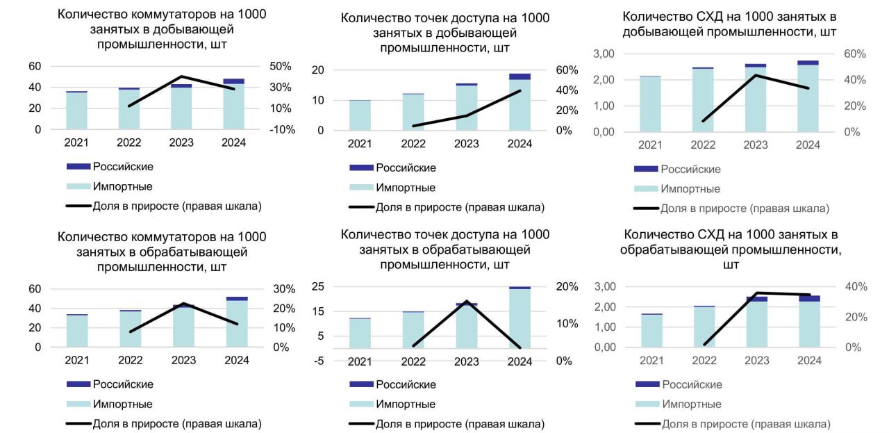 В итоге в промышленности цифровая трансформация идёт в условиях дефицита ресурсов и ограниченной доступности цифровых продуктов. В обрабатывающей промышленности доля импортного ПО в 2019 году составляла 47%, в 2022-м – 38%, а в 2024 году – 12%. Удельные расходы на покупку, аренду и разработку ПО (на 1 занятого в ценах 2015 года) в 2019 году составляли 6,78 тысячи рублей, в 2021 году – 9,28 тысячи рублей, а в 2024-м – 5,15 тысячи рублей.