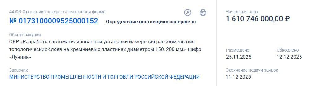 Минпромторг планировал выделить 1,6 млрд рублей на "разработку автоматизированной установки измерения рассовмещения топологических слоев на кремниевых пластинах диаметром 150, 200 мм", но в итоге цена контракта снизилась до 1,56 млрд. Исполнителем, как сообщает "МашТех", стала компания "Микрон" (группа компаний "Элемент").